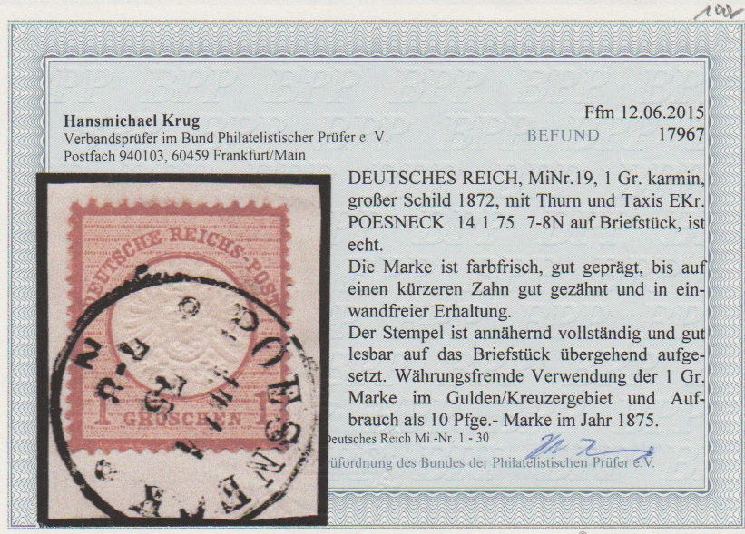 "Poesneck", der nachverw. K1 auf Briefstück 1 Gr. Brustschild vom 14.1.75, ein kurzer Zahn, seltener währungsfremder Aufbrauch der Groschen-Marke im ehemaligen Kreuzerbezirk. Fotoexp. Krug