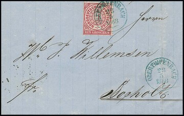 "Oelze", seltener nachverw. K1 ideal zentr. auf Kabinettbriefstück 1 Gr. NDP, gez., und auf 1 Gr. kl. Brustschild. Dito auf weiterem Bfst. und loser 1 Gr. NDP, diese aber Mängel