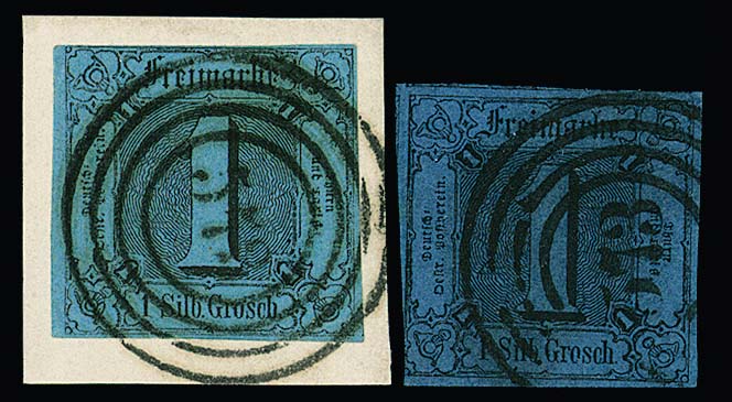1 Sgr. schw./dunkelblau und auf bläulichgrün (Bfst.) je mit preußischem NS "573" (Halle Bahnpost)