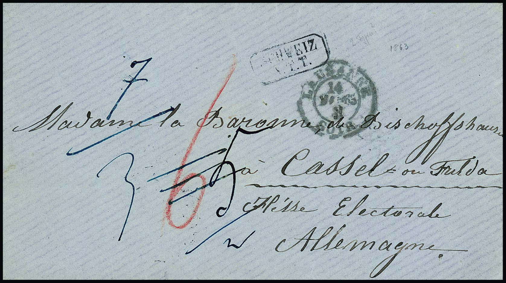 Transit, Ra2 "Schweiz n.T.T." auf zwei Briefen, von Lausanne 1863 nach Cassel, und Luzern 1861 nach Mainz