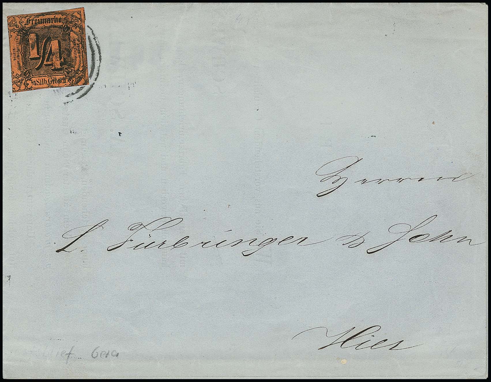 1/4 Sgr. schw./braunorange, Taxisschnitt, einzeln auf Orts-Drucksache 1861 aus Gera, Marke mit NS entwertet, aber ohne Orts-Nebenstempel
