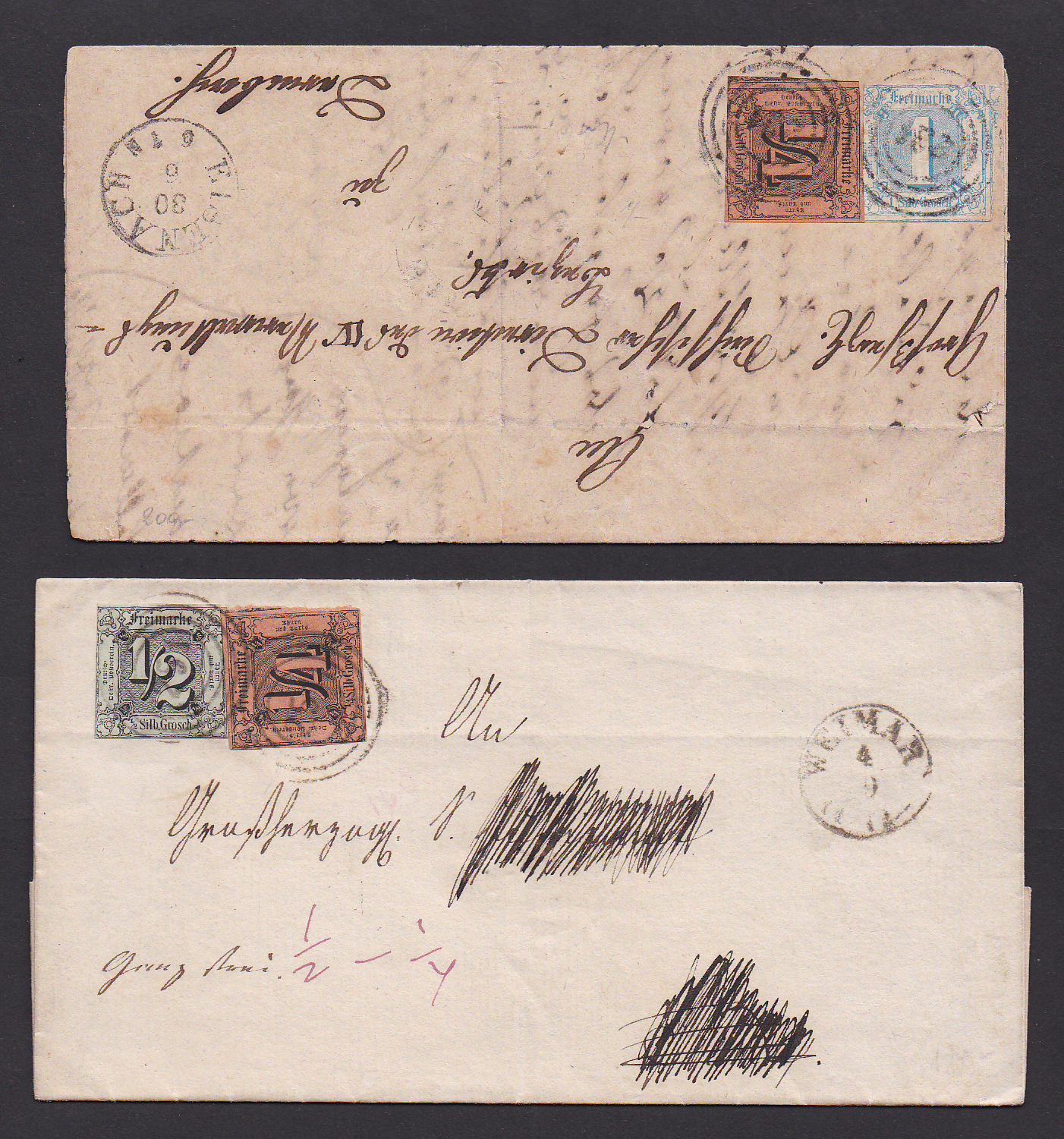 1/4 Sgr. schw./braunorange in Mischfrankatur mit 1/2 Sgr. schw./graugrün (Adresse gestrichen) bzw. 1 Sgr. blau, auf zwei Briefen aus Weimar bzw. Eisenach