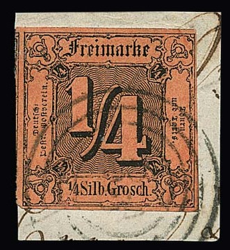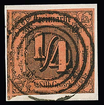 1/4 Sgr. schw./braunorange, breitrandig, rechts Bogenrand, auf Kabinettbriefstück mit NS "236" (Kaltennordheim), vielfach sign., u.a. Haferkamp, Bühler