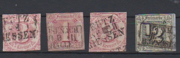Vier Werte (kl. Mgl.) mit preußischen Bahnpost-Stempeln, Ra3 "Eisenach-Halle" bzw. L3 "Deutz-Giessen"