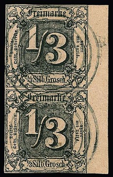 1/3 Sgr. schw./braunocker, repariertes, gestempeltes senkrechtes Paar mit ungewöhnlich sehr breitem rechtem Bogenrand, Mi. 600,-