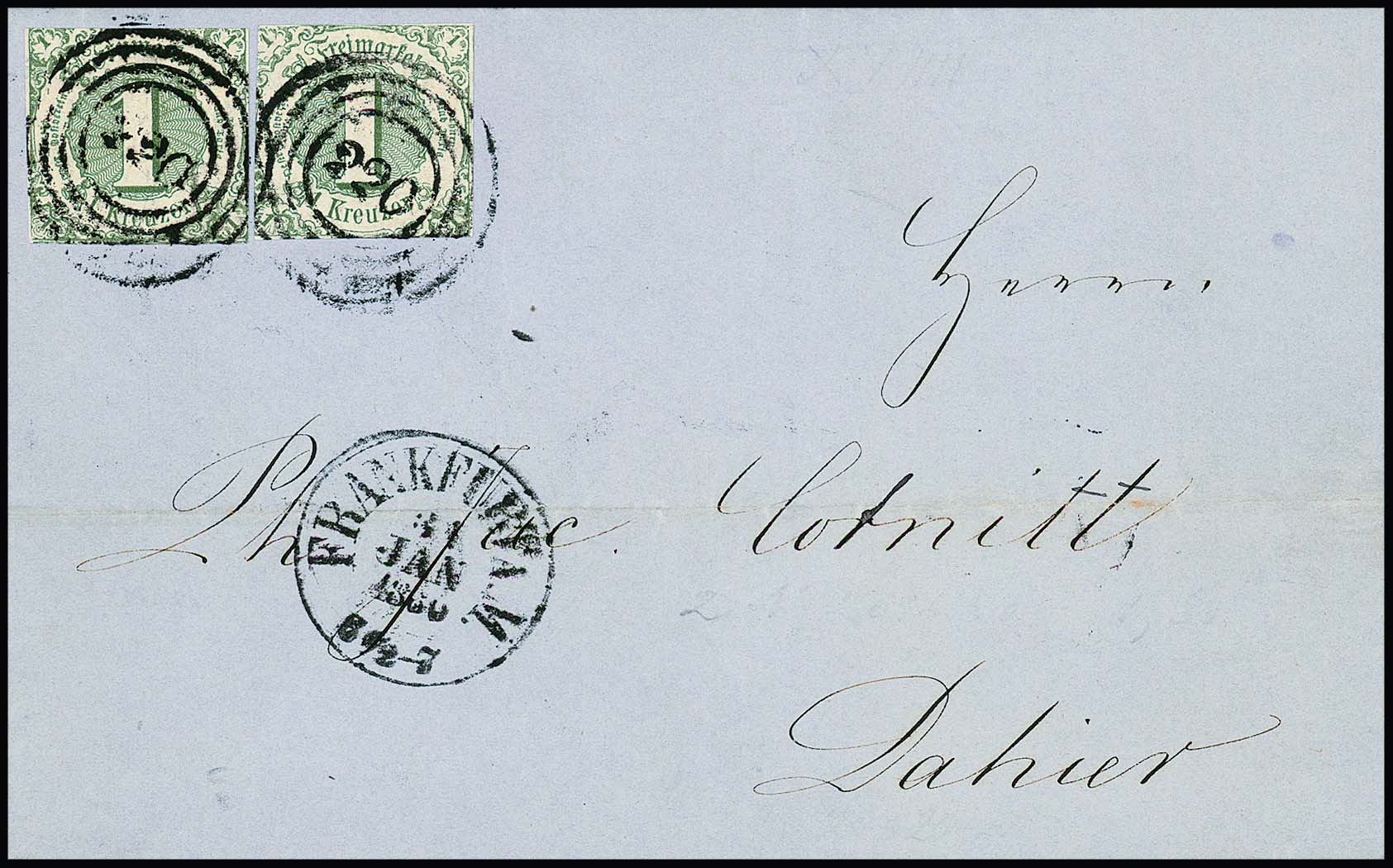 1 Kr. grün per zwei in gutem Taxisschnitt auf Orts-Faltbrief aus Frankfurt (1 Kr. Briefporto plus 1 Kr. Bestellgeld)