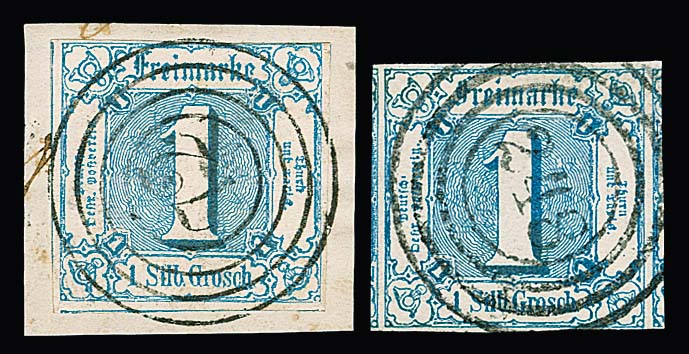 1 Sgr. hellblau, überrandiges Kabinettstück mit NS "248", sowie weitgehend breitrandig auf ideal gestempeltem Briefstück mit zentr. NS "72", sign. Engel bzw. Stock