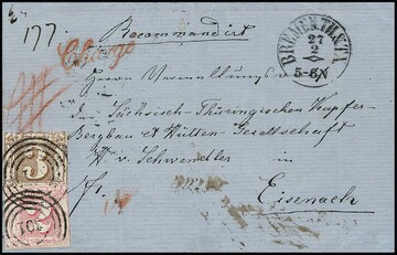 2 Sgr. karminrosa in Mischfrankatur mit 3 Sgr. ockerbraun, üblich geschnitten, auf Chargébrief von Bremen (NS "301" und Taxis-K1) nach Eisenach