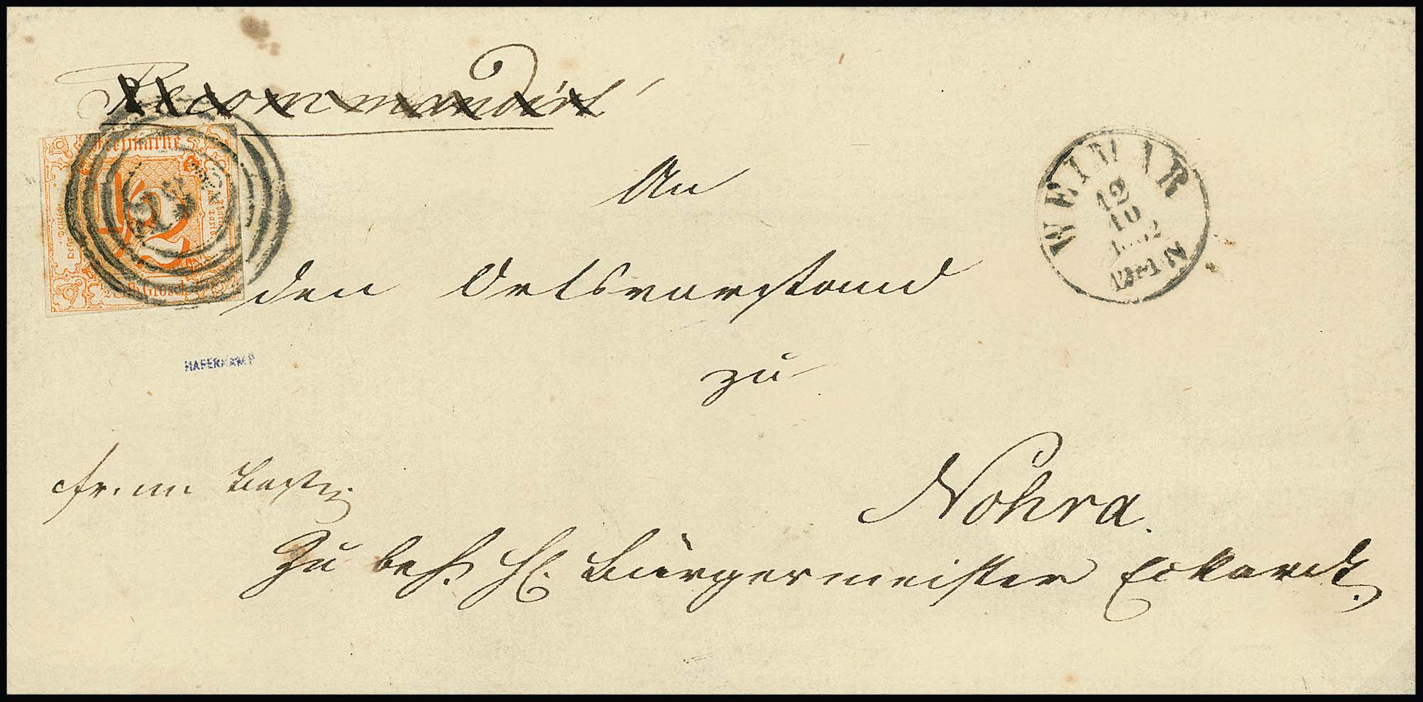 1/2 Sgr. rotorange (Taxisschnitt und kleine Knitter) als gute Einzelfrankatur auf Brief von Weimar in den eigenen Landbezirk nach Nohra, sign. Haferkamp