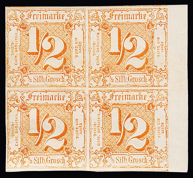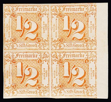 Zweite Ausgabe, 1/4 Sgr. schwarz und 1/2 Sgr. dunkelorange je in postfrischen Rand-Viererblöcken, 2 Sgr. blau im teils postfrischen Rand-Viererblock (eine Marke min. hell), 3 Sgr. im postfr. Sechserblock (linkes Paar Bugspur), sowie 9 Kr. ockerbraun im bis auf eine Marke postfrischen Viererblock. Mi. lose 1540,- ++