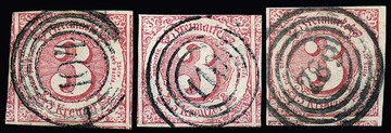 3 Kr. rot, drei überrandige Kabinett-/Luxusstücke, einmal vom Rand und Nebenmarken, die beiden anderen Marken drei bzw. alle vier Seiten Nebenmarken! Sign. Sem