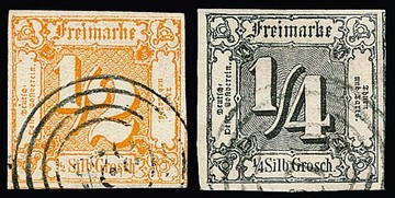 1/4 Sgr. schwarz, kleine linke untere Bogenecke, sowie 1/2 Sgr. orange, zwei ungewöhnlich riesenrandige Luxusstücke