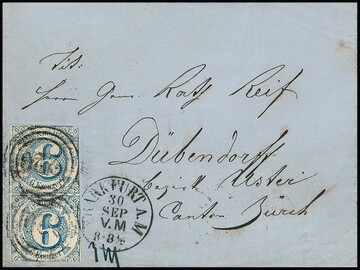 6 Kr. blau, etwas berührtes Paar auf Faltbrief von Frankfurt 1862 nach Dübendorf/Schweiz