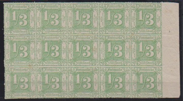1/3 Sgr. gelbgrün, postfrischer Rand-15er-Block (wenige Werte gering gelblich), Mi. lose 450,- +