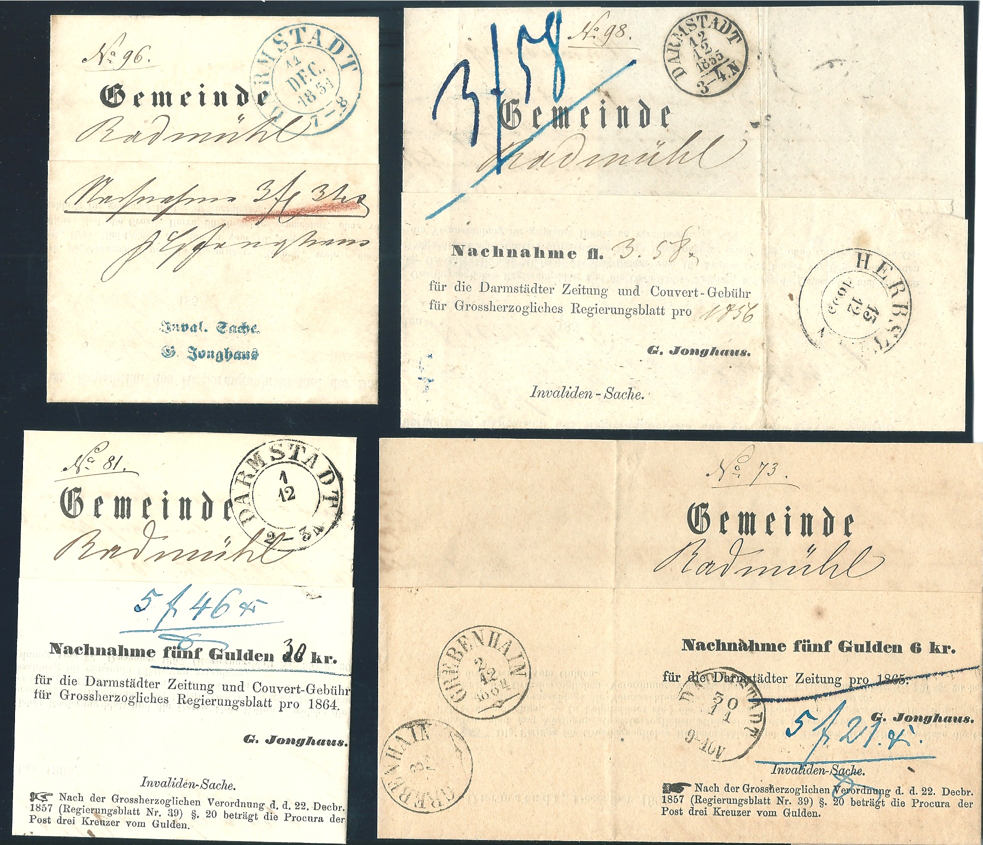 "Darmstadt", 1851-67, K1 bzw. K2 auf sechs vorgedruckten Nachnahmebriefen