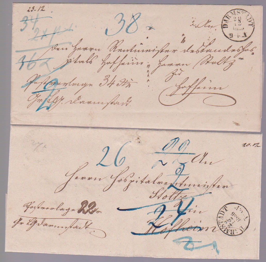 "Darmstadt", K1 1856 auf zwei "Auslagen"-Briefen nach Hofheim, Auslage 22 Kr. plus 2 Kr. Porto plus 2 Kr. NN-Bestellgebühr = 26 Kr., bzw. im anderen Falle 34 + 2 + 2 Kr. = 38 Kr. erhoben
