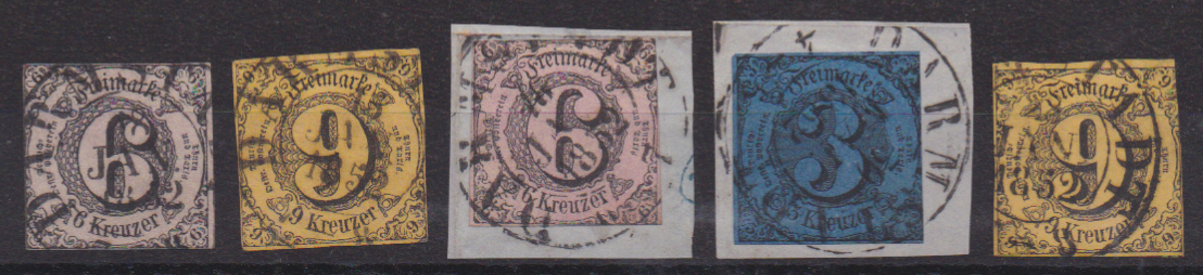 "Darmstadt", Orts-K2 auf fünf Werten 1. Ausgabe in etwas untersch. Erhaltung, vier mit frühen Daten aus Januar 1852, 15., 16., 18. und 28.1.
