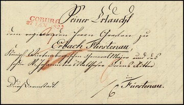 "Coburg", 1822, roter L2 auf dekor. Luxus-Adelsbrief aus Tambach an den Grafen zu Erbach in Fürstenau, innen Unterschrift des Grafen von Ortenburg