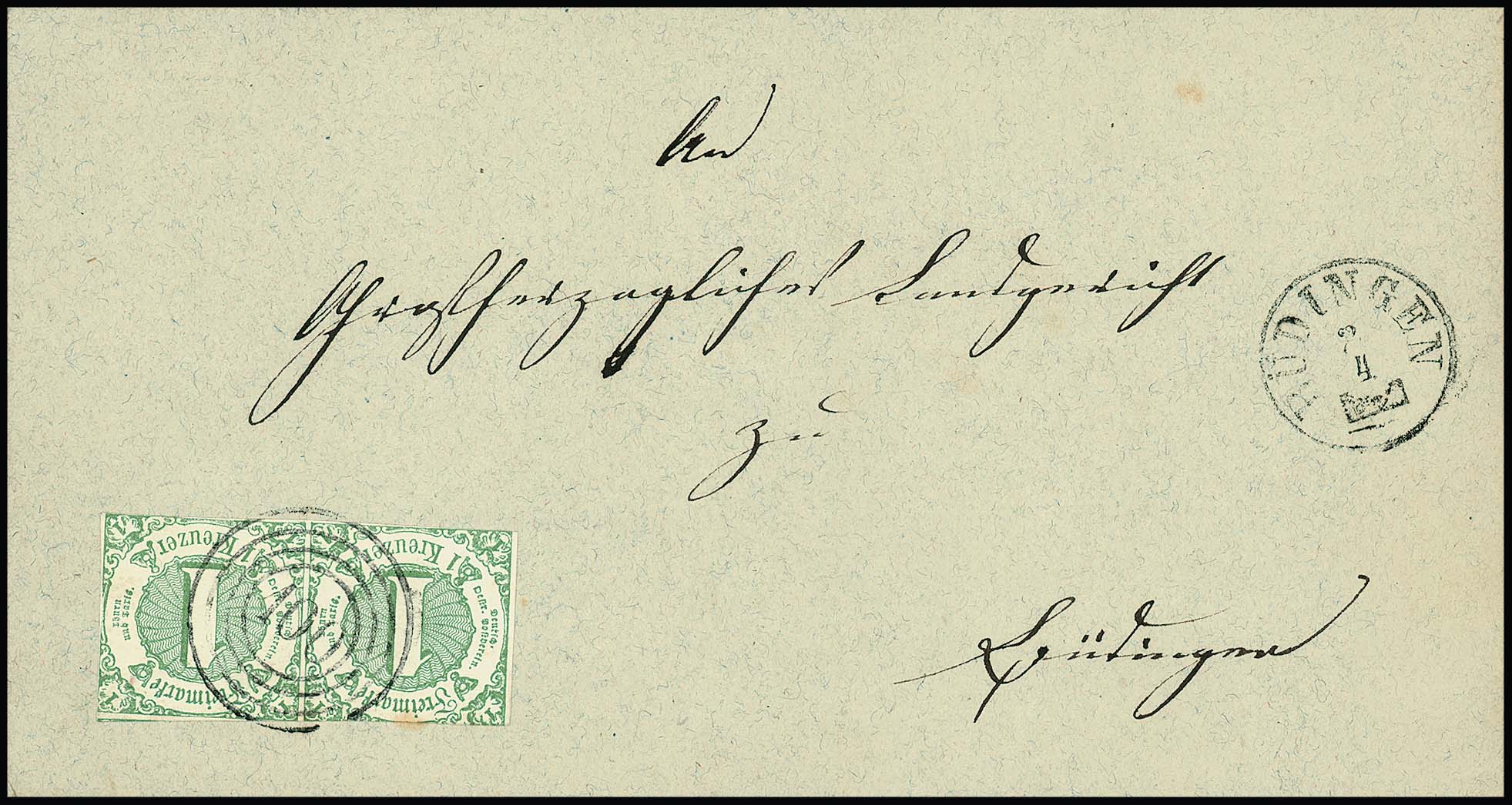 "100" nebst K1 "Büdingen" auf Brief mit Paar 1 Kr. grün (linke Marke winziger Braunpunkt) innerhalb des eigenen Landbezirkes (selten!)