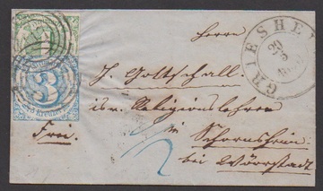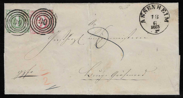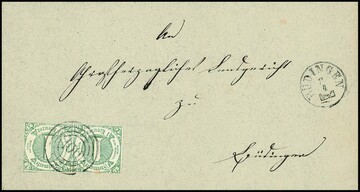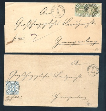 "95" nebst K1 "Bensheim" auf zwei Faltbriefen, mit überrandigem Kabinettstück 3 Kr. hellblau, bzw. Paar 1 Kr. grün (etwas getönt), beide an das Landgericht in Zwingenberg