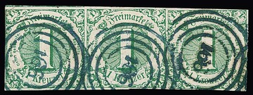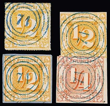 "71" (Steinbach-Hallenbg.) je in blau auf vier Werten (drei versch. Ausgaben, ein Briefstück mit 1/4 und 1/2 Sgr.)