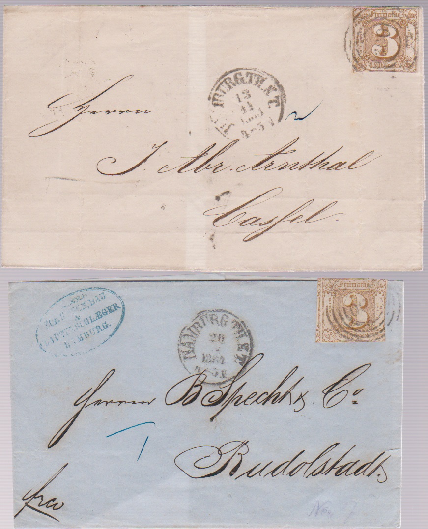"300" nebst taxischem K1 von Hamburg auf zwei Faltbriefen 3 Sgr. ockerbraun nach Rudolstadt bzw. Cassel