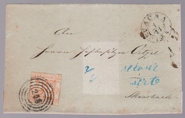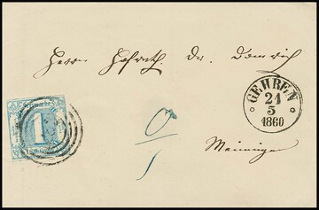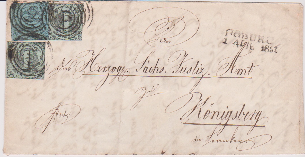 "291" nebst K1 "Gera" auf Brief mit 1/2 Sgr. (oben Schere) ins sächs. Altenburg, sowie auf losem Kabinettpaar 1/2 Sgr. (alleine 150,- Mi., Fotoexp. Sem)