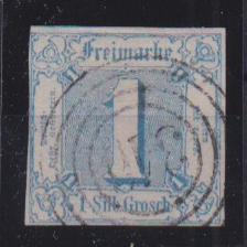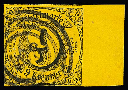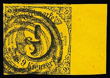 "301" (Bremen) klar auf großem rechtem Randstück 9 Kr. schw./gelb (11mm Rand), erste Ausgabe