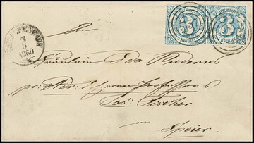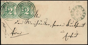 "308" nebst K2 "Gerstungen", je in blau, klar auf Brief mit Paar 1/2 Sgr. grün, rechte Marke überrandig, linke kl. Vortrennschnitt und Tintenspur