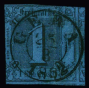 "Greiz", kuriose Doppelentwertung von sowohl blauem L1 als auch blauem K2 auf 1 Sgr., 1. Ausgabe (etwas dünn)