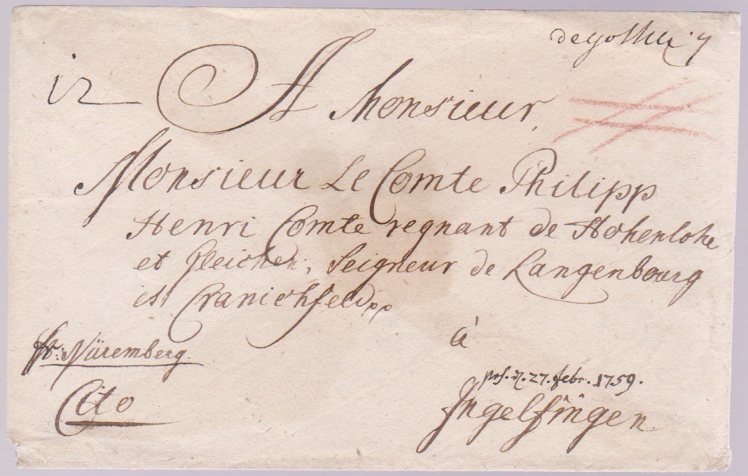 "Gotha", 1759, frühe hs. Aufgabe "de Gotha" auf datierbarer Adelsbriefhülle