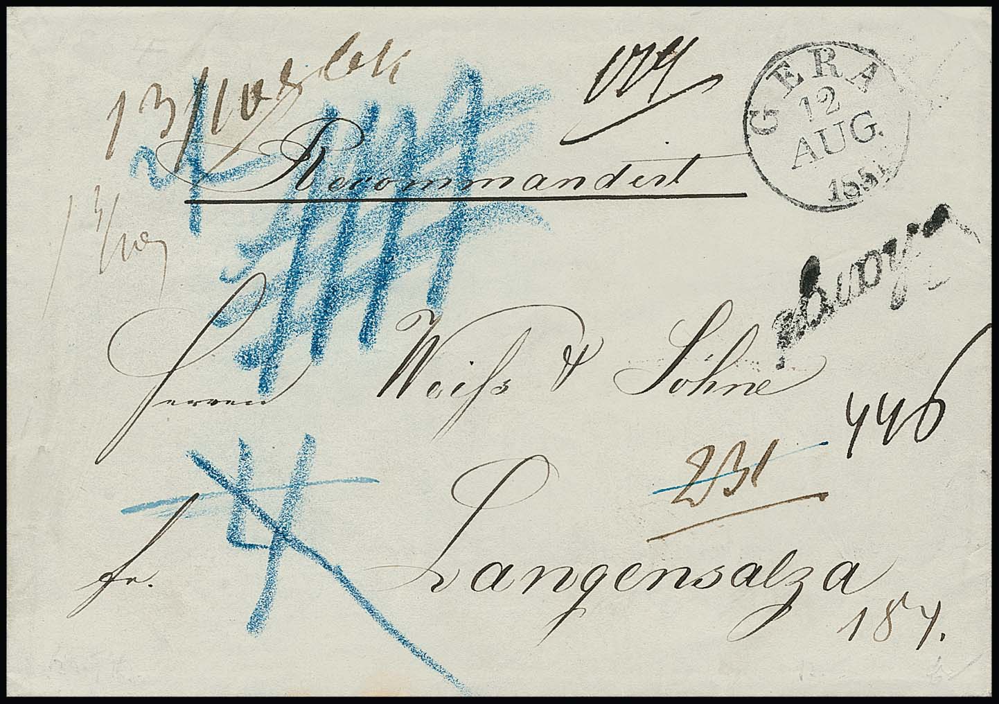 "Gera", 1854, K1 auf seltenem recommandiertem Portobrief nach Langensalza (nur bis 31.12.1860 zulässig), 4 Sgr. Briefporto in der 2. Gewichtsstufe, Chargégebühr bar bezahlt