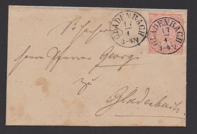 "Gladenbach", nachverw. K1 klar auf kleinem Briefchen aus dem eigenen Landbezirk mit Einzelfrankatur NDP 1/2 Gr. (kl. Mgl.), ex Spalink