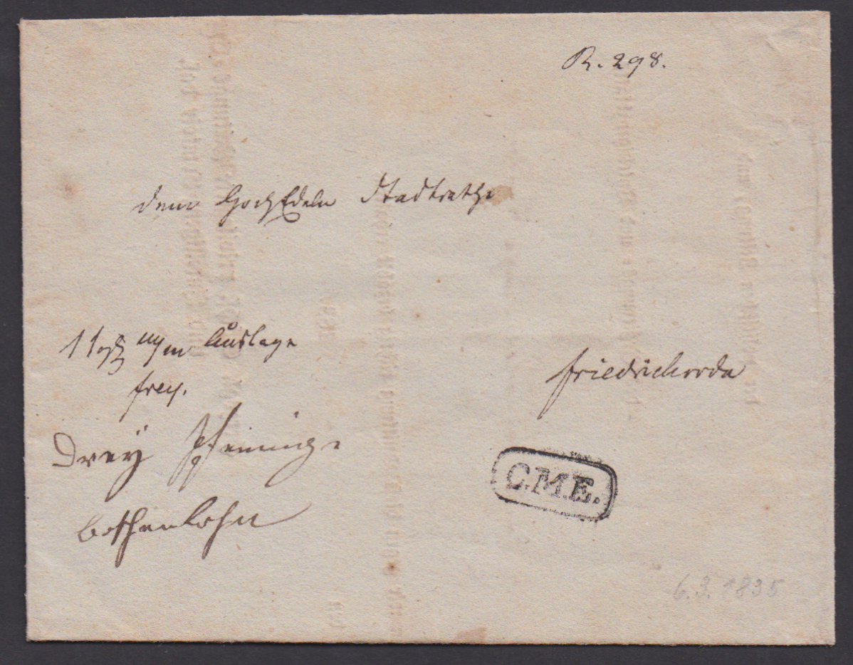 "Gotha", 1835, "herzogl. Sächs. privilegierte Zeitungs-Expedition und Intelligenz-Comtoir das.", Brief der Privatpost C. Mevius Erben mit Ra1 "C.M.E." als Zeitungsrechnung nach Friedrichroda