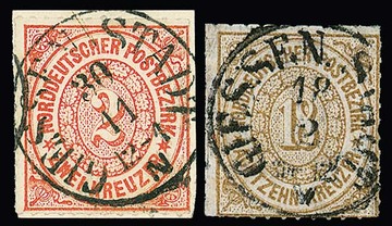 "Giessen Stadt", nachverw. K1 auf 20 Werten NDP, dabei 2(4) und 18(3) Kr., sowie einmal hs. auf 30 Gr. (hell)