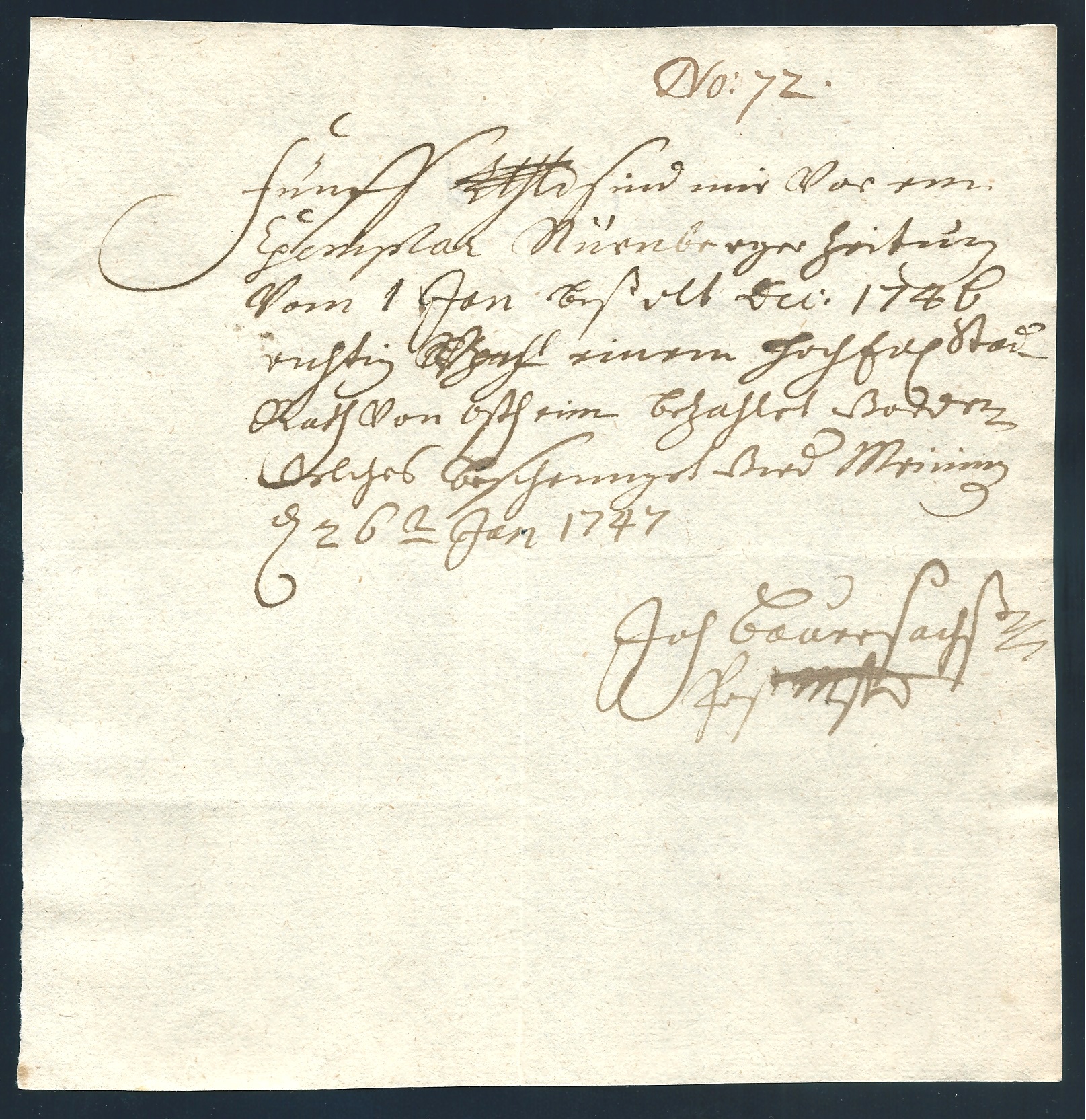 "Meiningen", 1747, frühe handschriftliche Postmeister-Quittung für den Bezug der "Nürnberger Zeitung"