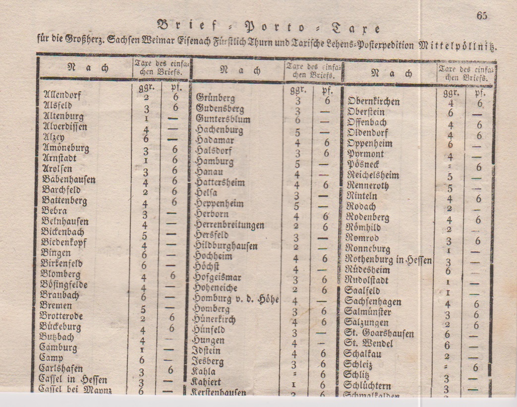 "Mittelpöllnitz", (1750), dekor. "Brief-Porto-Taxe", Tabelle mit den Postgebühren nach Orten in Sachsen-Weimar-Eisenach