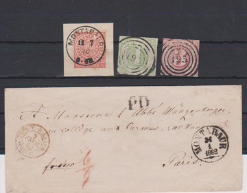 "Montabaur", K1 1862 auf bar bezahltem Damencouvert ("6/9") nach Paris, dazu zweimal der NS "195" lose und Ablöse-K1
