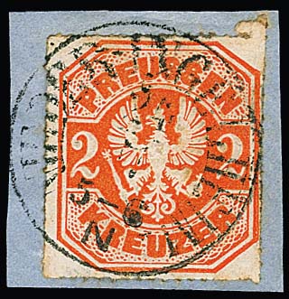 "Mainz", 1863, schwarzer K2 (mit Kreuzen) bzw. roter K2 (mit Ringen), zwei dekorative Paketbriefe (ein Befund Sem)