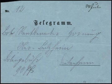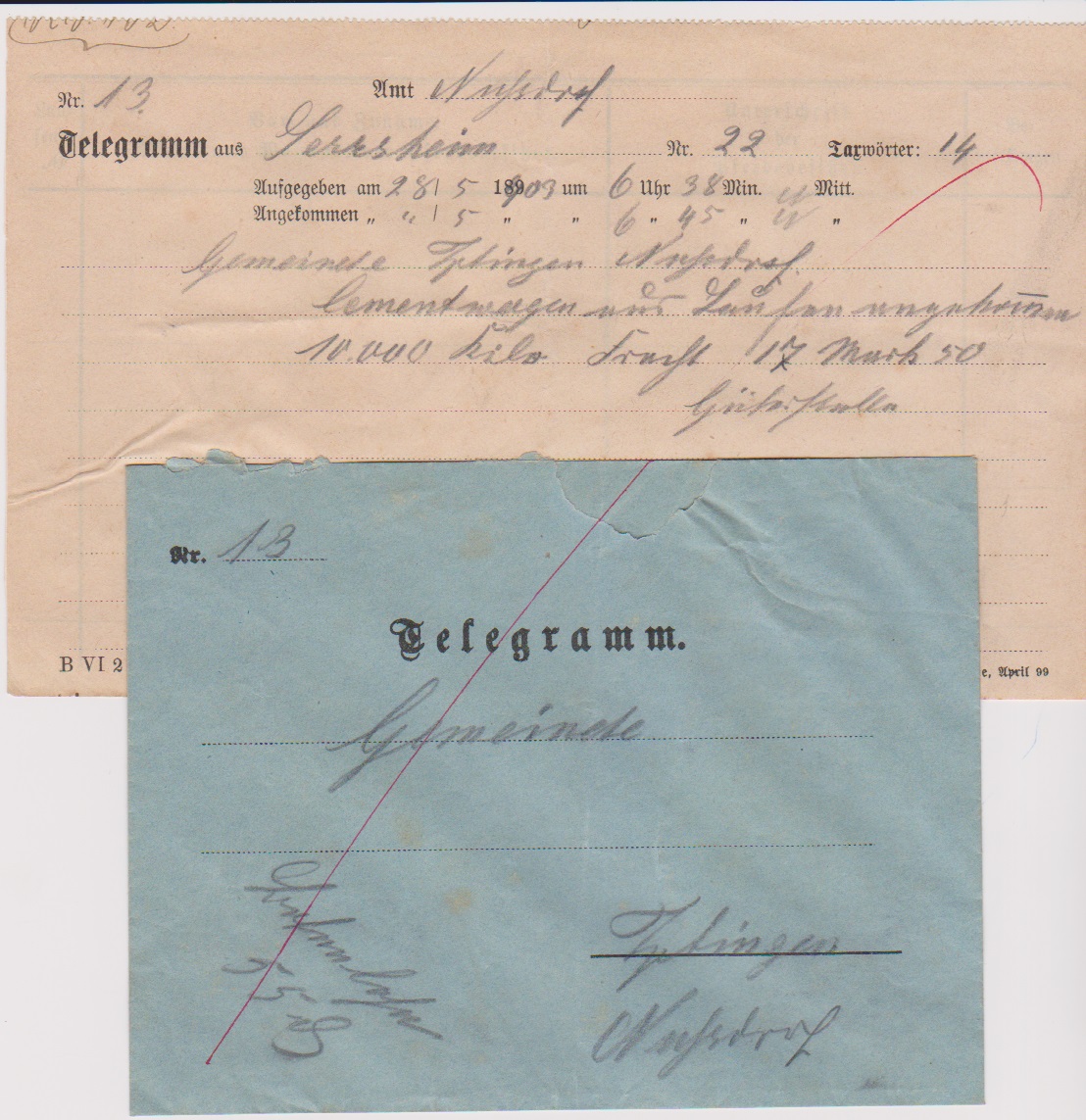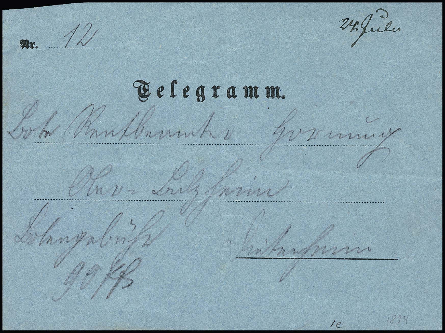 "Dietenheim", 1894, blaues Telegramm-Couvert mit entspr. Telegramm-Inhalt, hs. "botengebühr 90 Pfg." für die expresse Bestellung