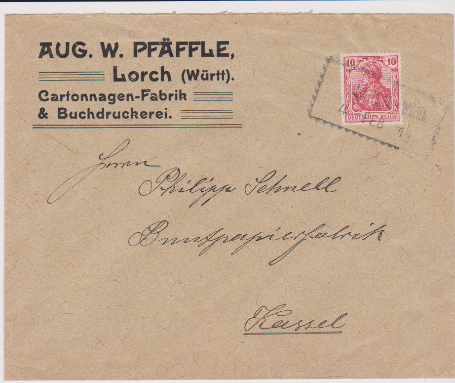 "Lorch i. Württb.", Wander-Ra2 (Form III) auf Couvert mit 10 Pfg. Germania 1911