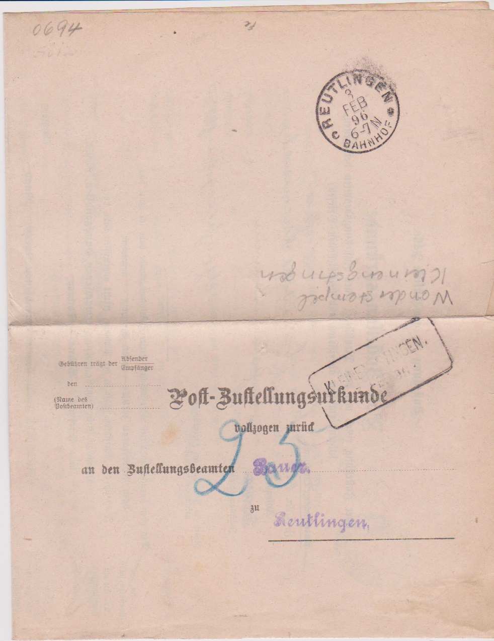 "Kleinengstingen", Wander-Ra2 (Form II) auf unfrankierter Zustellurkunde 1896