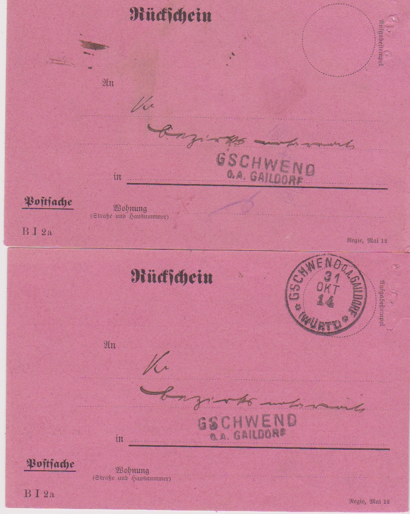 "Gschwend O.A. Gaildorf", L2 bzw. K1 auf zwei rosa Rückscheinen 1914
