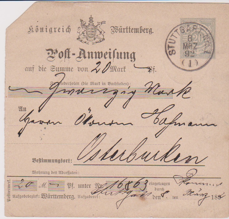 Postanweisungs-Ganzsachenkarte 20 Pfg. (Wohnungsangabe einzeilig) von Stuttgart 1894