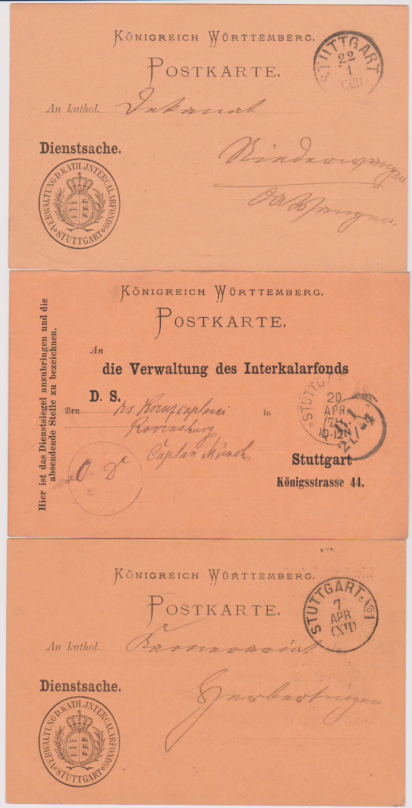 1877/78, vier portofreie beige Vordruckkarten des kathol. Interkalarfonds aus Stuttgart
