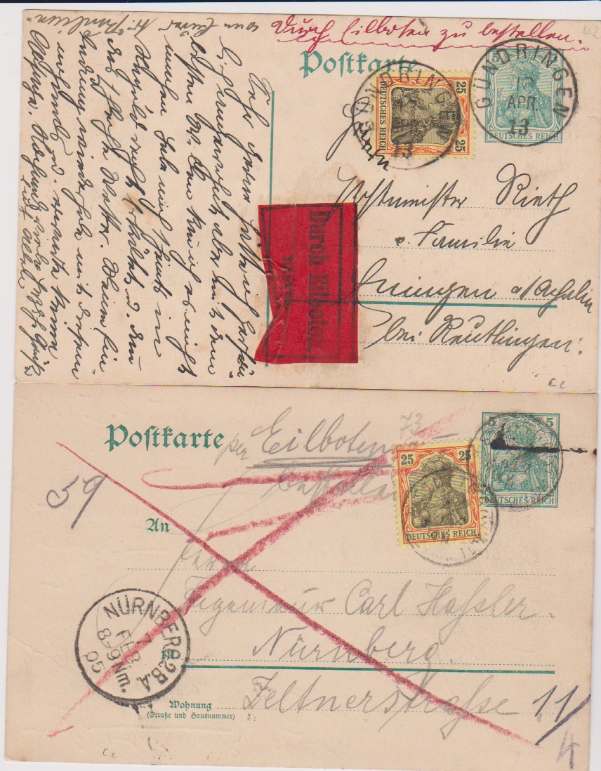 25 Pfg. Germania (mit und ohne Wz.) je auf 5 Pfg.-Ganzsachenkarte, als Expreßkarten aus Gündringen bzw. Stuttgart 1905/13