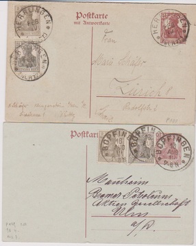 2 und 2 1/2 Pfg. Germania je auf zwei versch. Ganzsachenkarten 5 1/2 Pfg., 1919, von Bopfingen nach Ulm, und Herrlingen als Doppelkarte nach Zürich