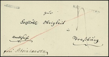 "Ebingen", (1802), L1 "v. EBINGEN" klar auf Pracht-Briefhülle nebst Transit-L1 "RHEINHAUSEN" nach Straßburg