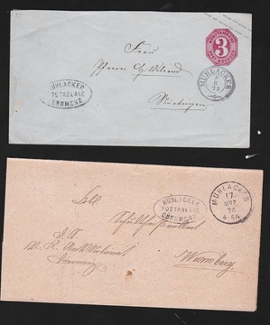 "Dürrmenz-Mühlacker", Postablagestpl. klar auf Ganzsache 3 Kr. und auf Dienstbrief, 1873/75