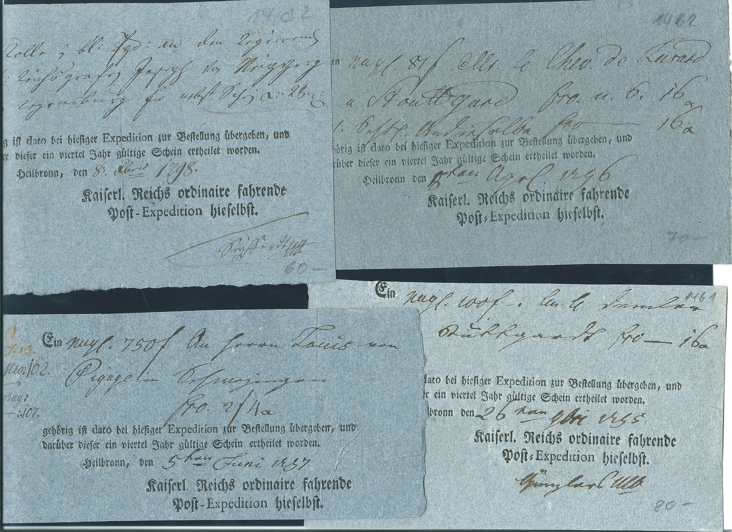 "Heilbronn", 1758-1777, vier seltene Ortsdruck-Einlieferungsscheine und eine Zeitungsquittung